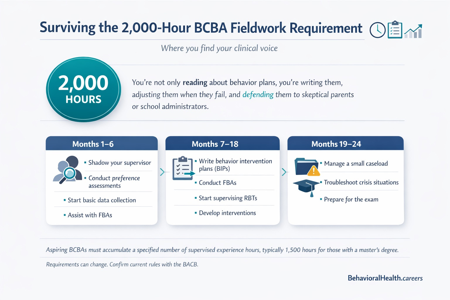 - Months 7-18: You’ll write behavior intervention plans (BIPs), conduct functional behavior assessments (FBAs), and start supervising RBTs. Fieldwork includes developing and implementing behavior analytic interventions tailored to client needs.