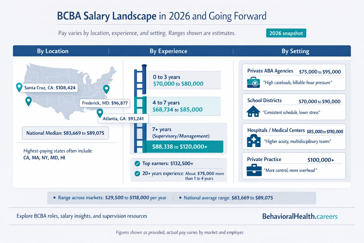 The national average salary for BCBAs is $83,669 to $89,075, but that number shifts dramatically based on geography, experience, and work setting. Here’s the breakdown: