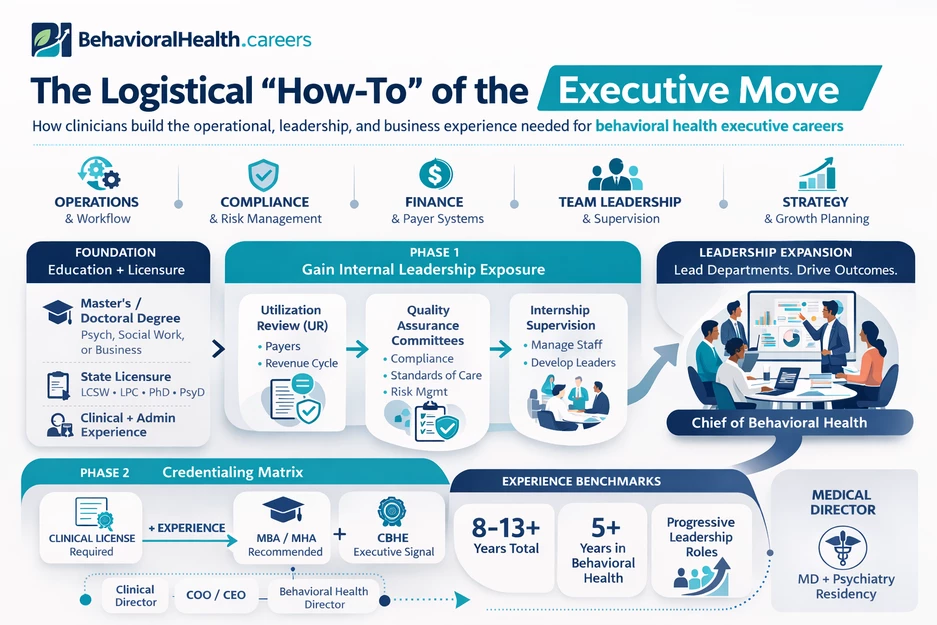Moving into behavioral health executive careers requires deliberate accumulation of non-clinical data points and leadership experience.