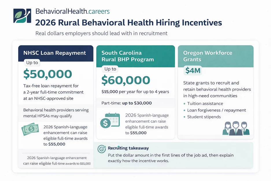 Ensure your facility is NHSC-approved. This allows your hires to access up to $50,000 in tax-free loan repayment for a two-year commitment. For a clinician with six-figure student debt, this is more valuable than a signing bonus. Check eligibility at https://behavioralhealth.careers/blog/student-loan-repayment-for-behavioral-health-professionals.