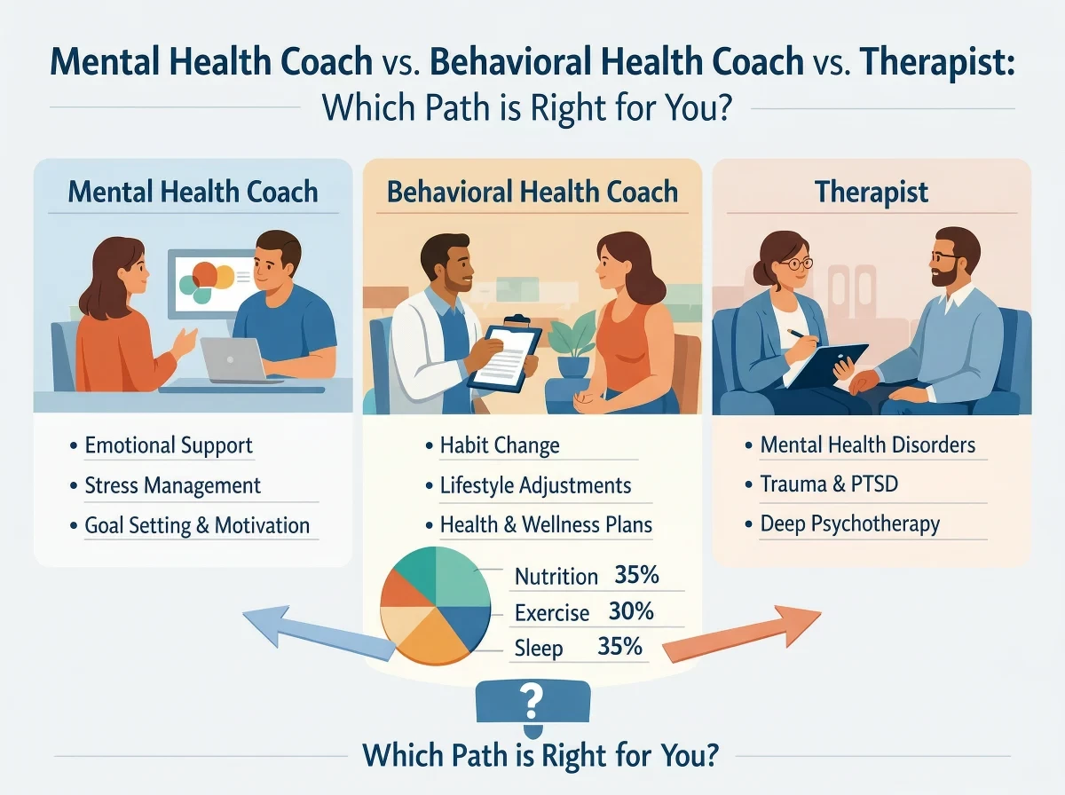 - Behavioral Health Coach: Offers action-oriented, collaborative support and focuses on specific areas of habit change, protocol-based intervention (often in primary care), and measurable lifestyle outcomes. Behavioral health coaches do not diagnose or treat illness.