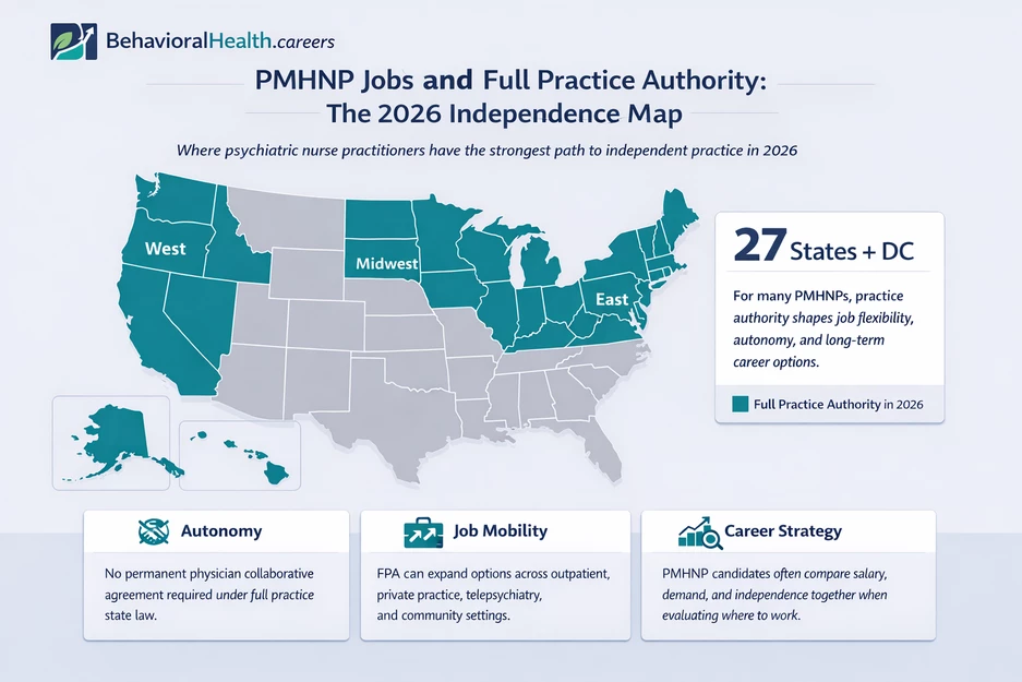 This is known as Full Practice Authority (FPA). As of 2026, the list of jurisdictions where PMHNPs can practice independently has grown to 27 states plus the District of Columbia.