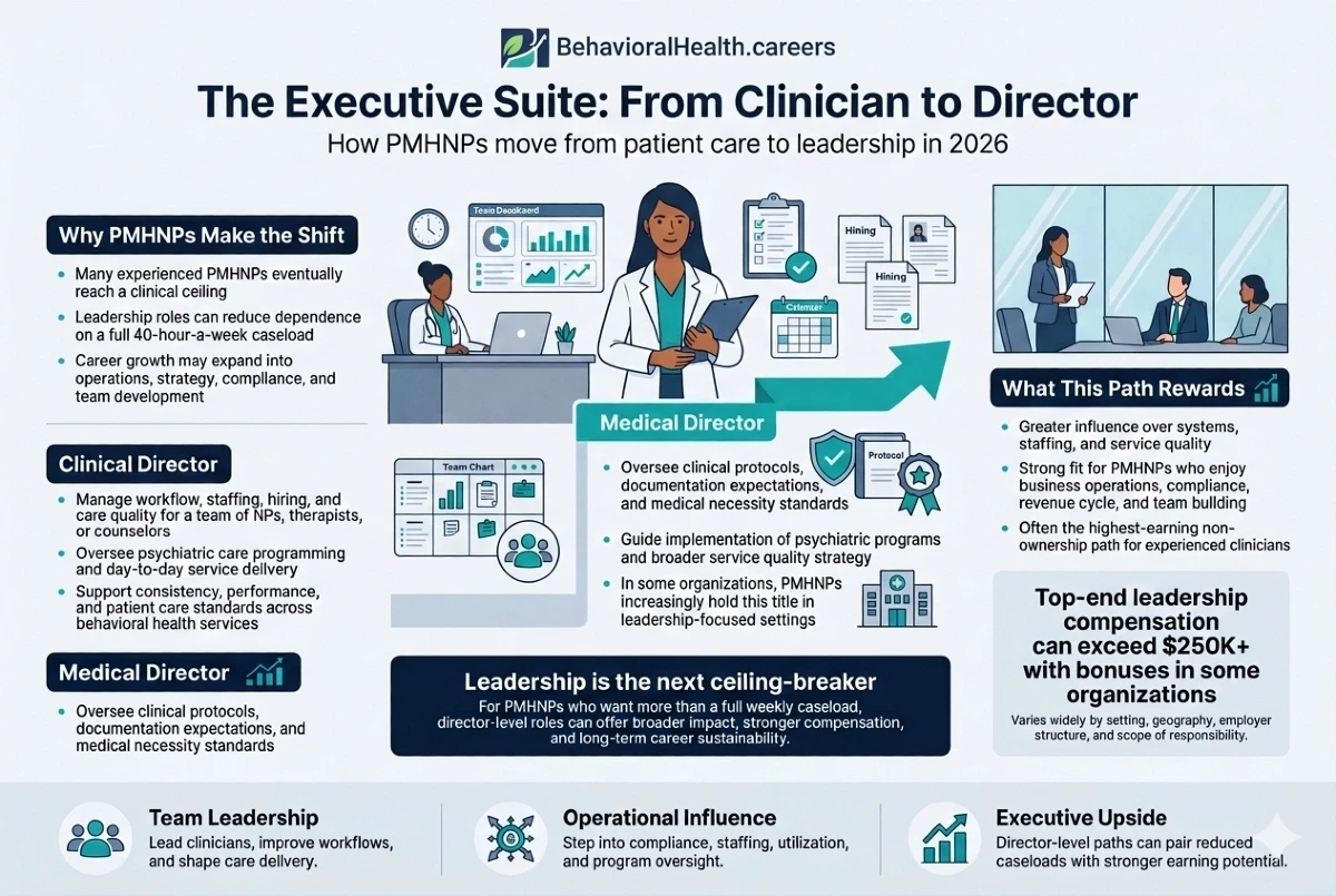 Many PMHNPs reach a “clinical ceiling” where they want to step away from the 40-hour-a-week caseload. In 2026, more NPs are moving into executive leadership.