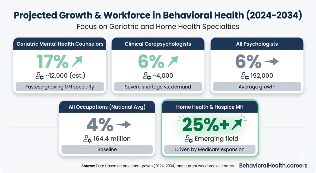 The takeaway: geropsychology jobs are growing 2x to 4x faster than the general labor market, with home health roles leading the surge.