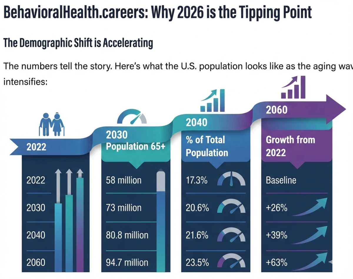The convergence is clear: an aging population, a massive workforce shortage, expanding reimbursement models, and competitive salaries. Geropsychology is no longer a niche specialty: it's a mainstream growth sector with decades of sustained demand ahead.