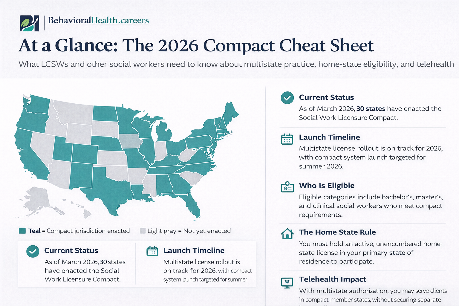 Disclaimer: This guide provides an overview of the Social Work Licensure Compact as of March 2026. Licensure requirements and compact participation are subject to change by individual state boards. This is not legal advice.